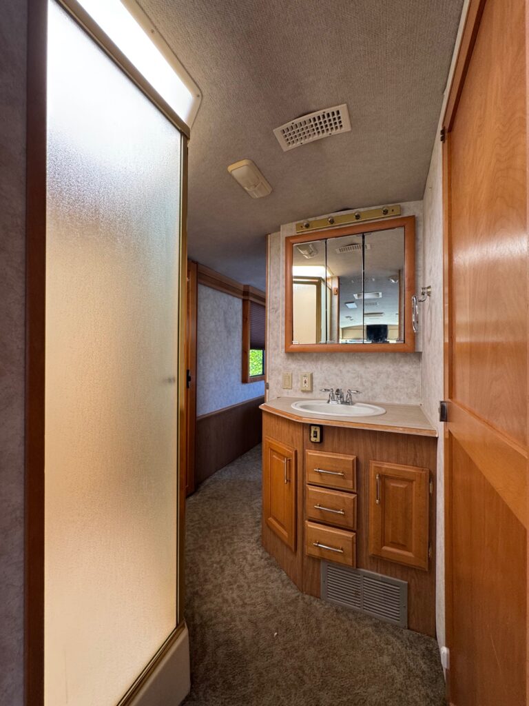 Split Bathroom with Corner Shower/Skylight and Vanity in Hallway